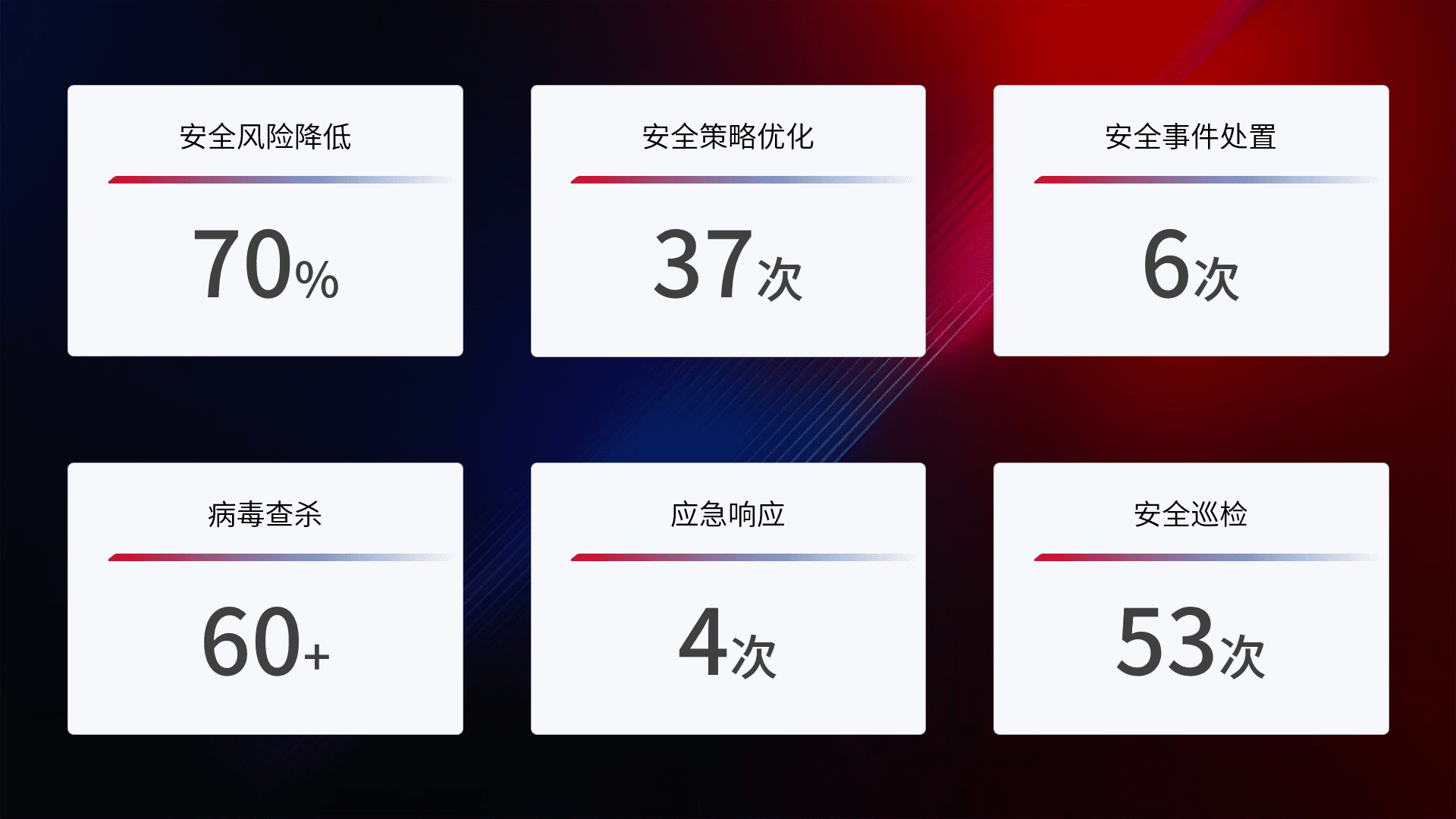 提供全面的安全事件报告体系,,包括处置报告、、、、周报、、、季度和年度总结,,,结合持续监控,,,,帮助客户深入了解网络安全状况。。。。