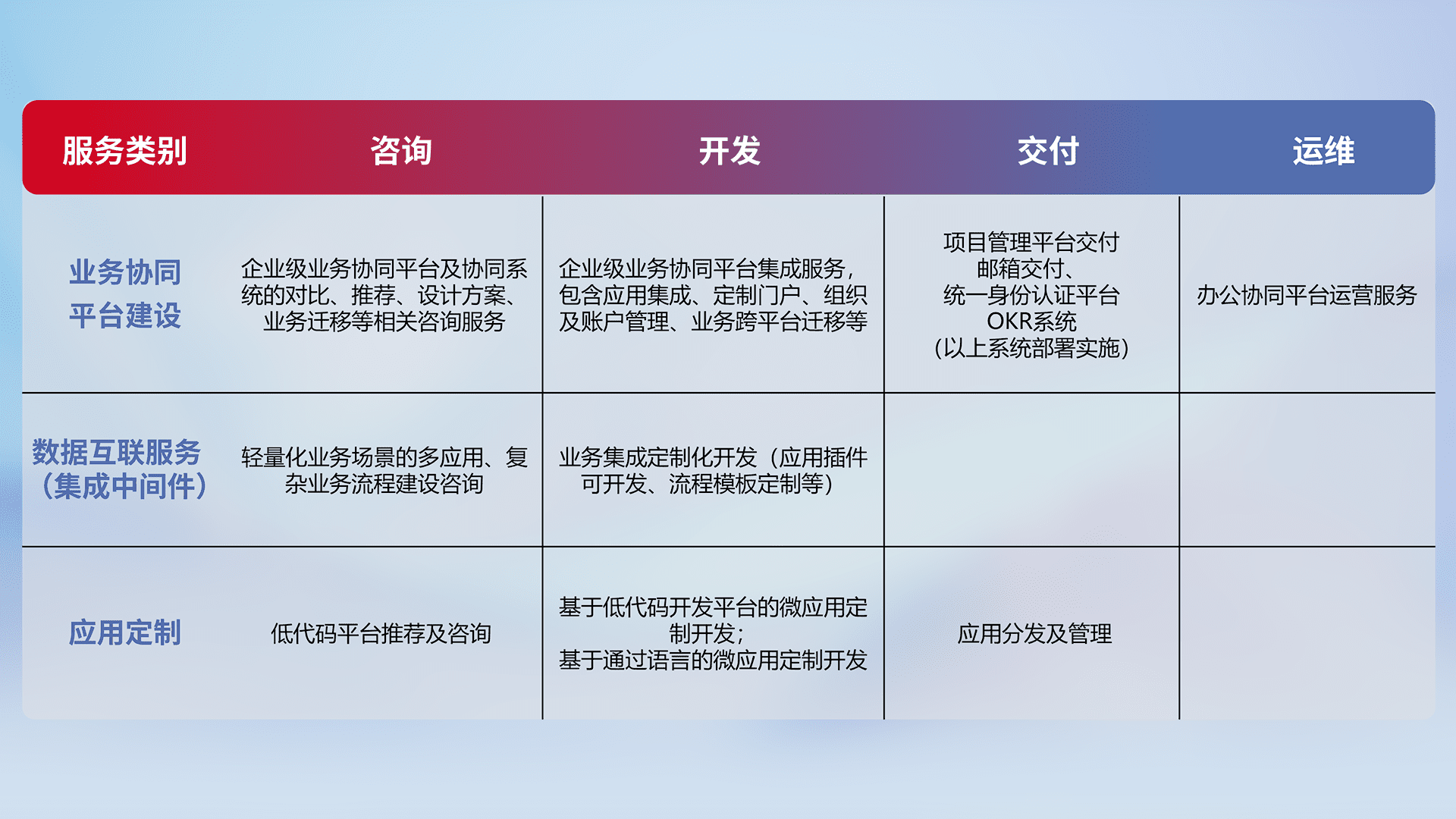 针对钉钉、、、企微、、、IDaas等平台级产品提供产品的规划、、方案、、、交付、、、定制化开发等服务,,,实现如统一协同办公、、、智能客户服务、、混合会议管理、、智能数据查询、、、、等业务场景,,,实现数字化转型。。